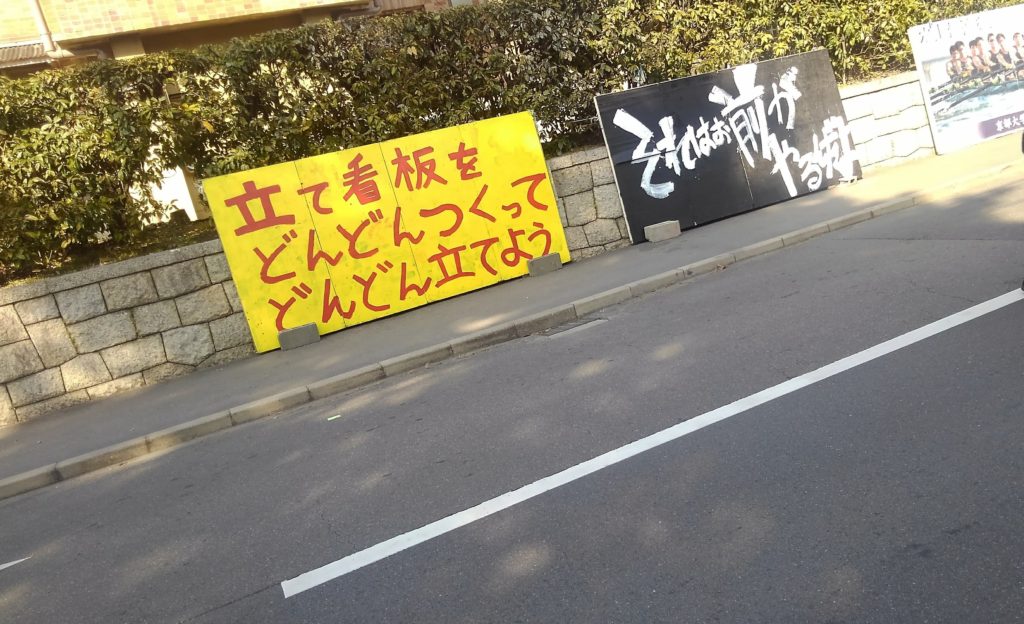 「タテカン」ってなにかと話題ですよね。百万遍に何か立ってればそれをめぐってTwitterがさわがしくなる。その内容に、形式に、職員の撤去のさまに、そしてタテカンの在り方や是非にまで議論(レスバトル)が広がっていく…。