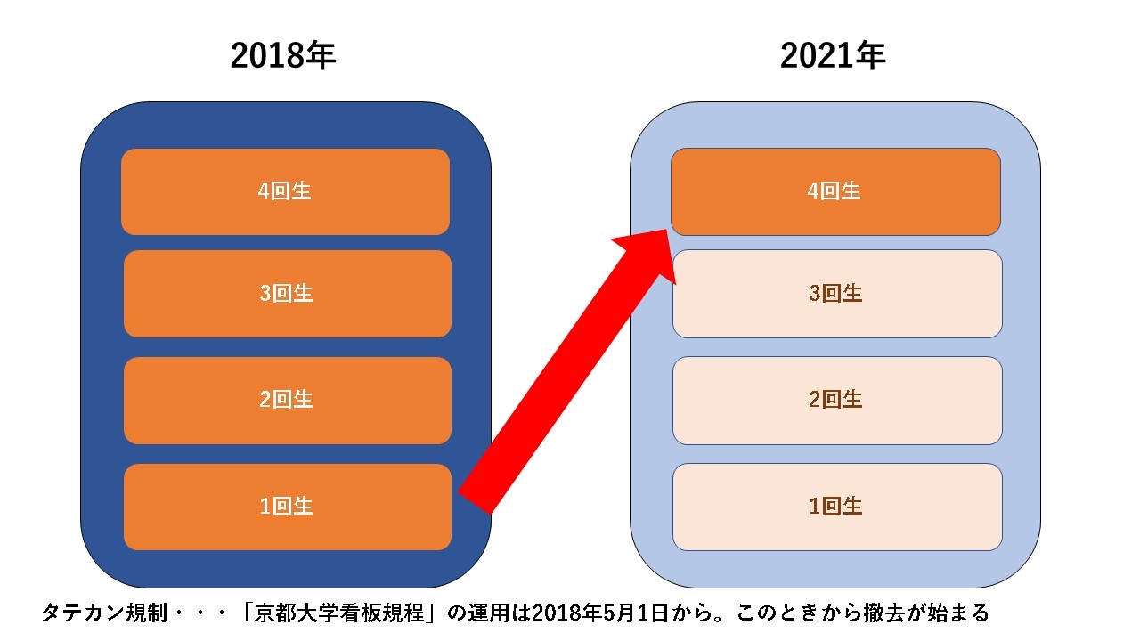 タテカンが当たり前の日常を知っているのはもう4回生だけになった(しかも2018年5月からタテカン規程だから、4回生ですら1か月くらいしか知らないわけだ)。1~3回生にとって、石垣ははじめから「こざっぱりしてはる」し、それが当然だと感じている。タテカンが出てくるのは非日常で、だからこそTwitterでもお祭り(議論・拡散)になる。
