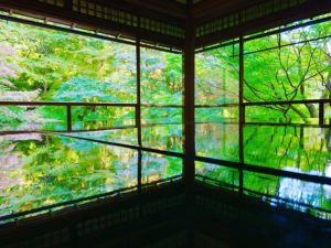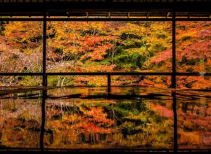 京都・瑠璃光院は、黒光りする机に反射する紅葉の美しさで有名。写真どーん。