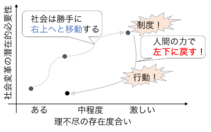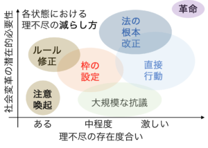理不尽に対する手段のいくつかの例を整理したイメージ図を下に示す(図1)。横軸に理不尽の強さ、縦軸に潜在的に必要とされる社会変革(あるいは、変革への願い)の強さをとり、各点において有効な手段をグラフ内に記載した。概ね丸の中では記載された手段が有効であるというざっくりとしたイメージである。